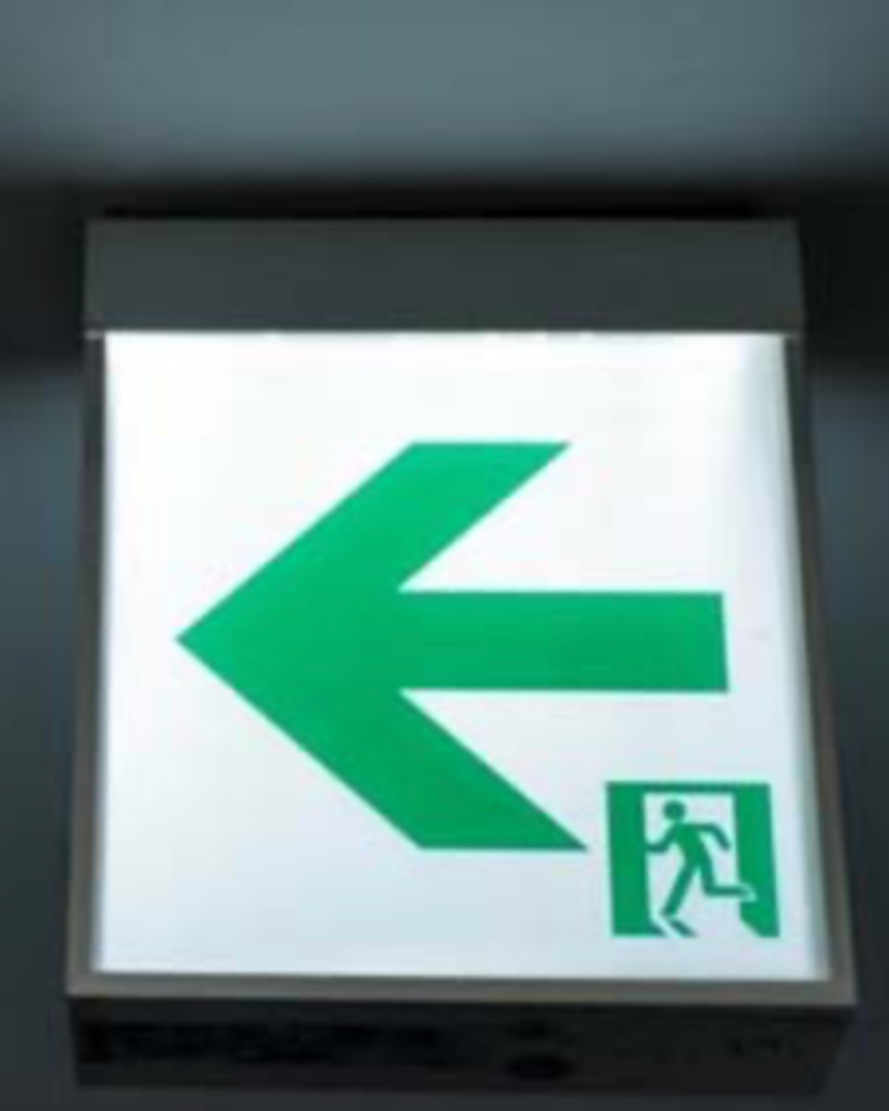 廊下にいたら、まずは「白地の誘導灯」を探してください。そこに描かれた矢印の方向へ進みます。進んでいくうちに、ドアの上に「緑地の誘導灯」が見えたら、そこが脱出ルートの入り口です。